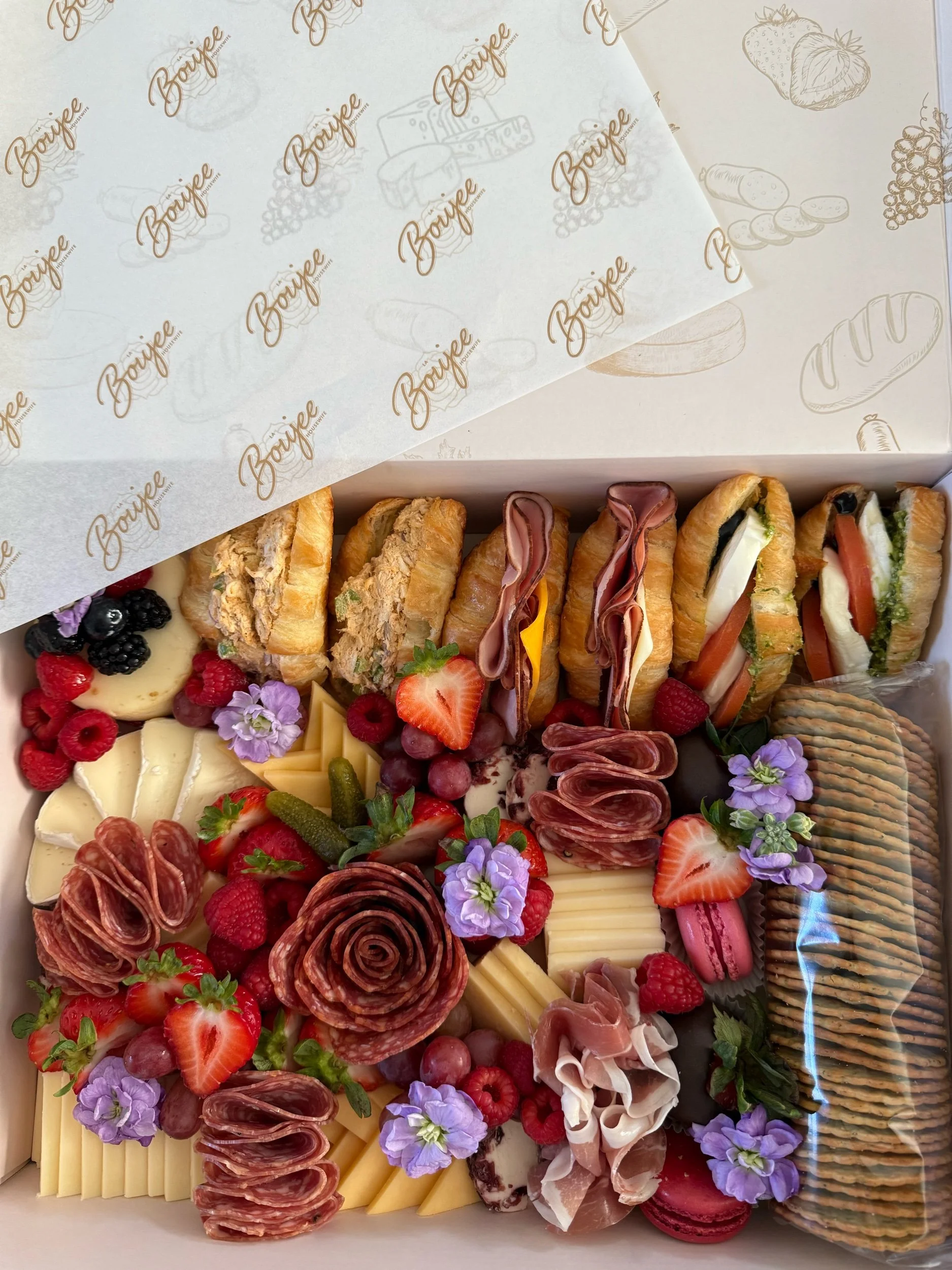 Grazing products Grazing products All La Boujee Housewife Gift Card from $25.00 Delivery Fee from $5.00 Lil Boujee Boxes from $10.00 Boujee Boxes from $45.00 Fruit & Crudités $75.00 Boujee Lunch Boxes/Salads/Sandwiches from $8.50 The Jane $65.00 Cups/Boats/Cones from $5.00 Boujee grazing single number or letter from $30.00 Baked Brie $20.00 Extra Crackers $3.00 Chocolate covered strawberries from $2.00 Salami Roses from $3.50